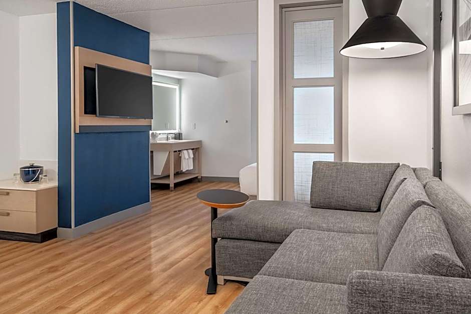 This room features a refrigerator and flat-screen cable TV.